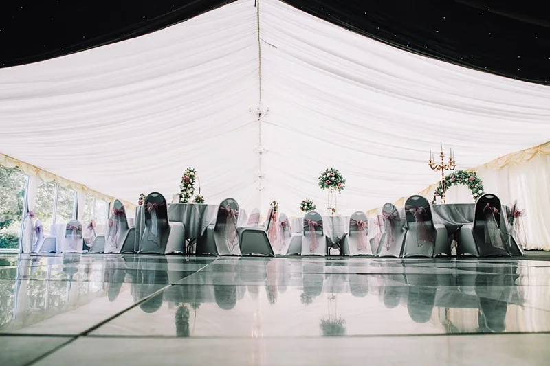 Our stunning floor-to-ceiling glass fronted marquee with crystal-chandeliers, starry-sky dance floor, fully licensed bar and chill-out area can host weddings up to 200 guests.