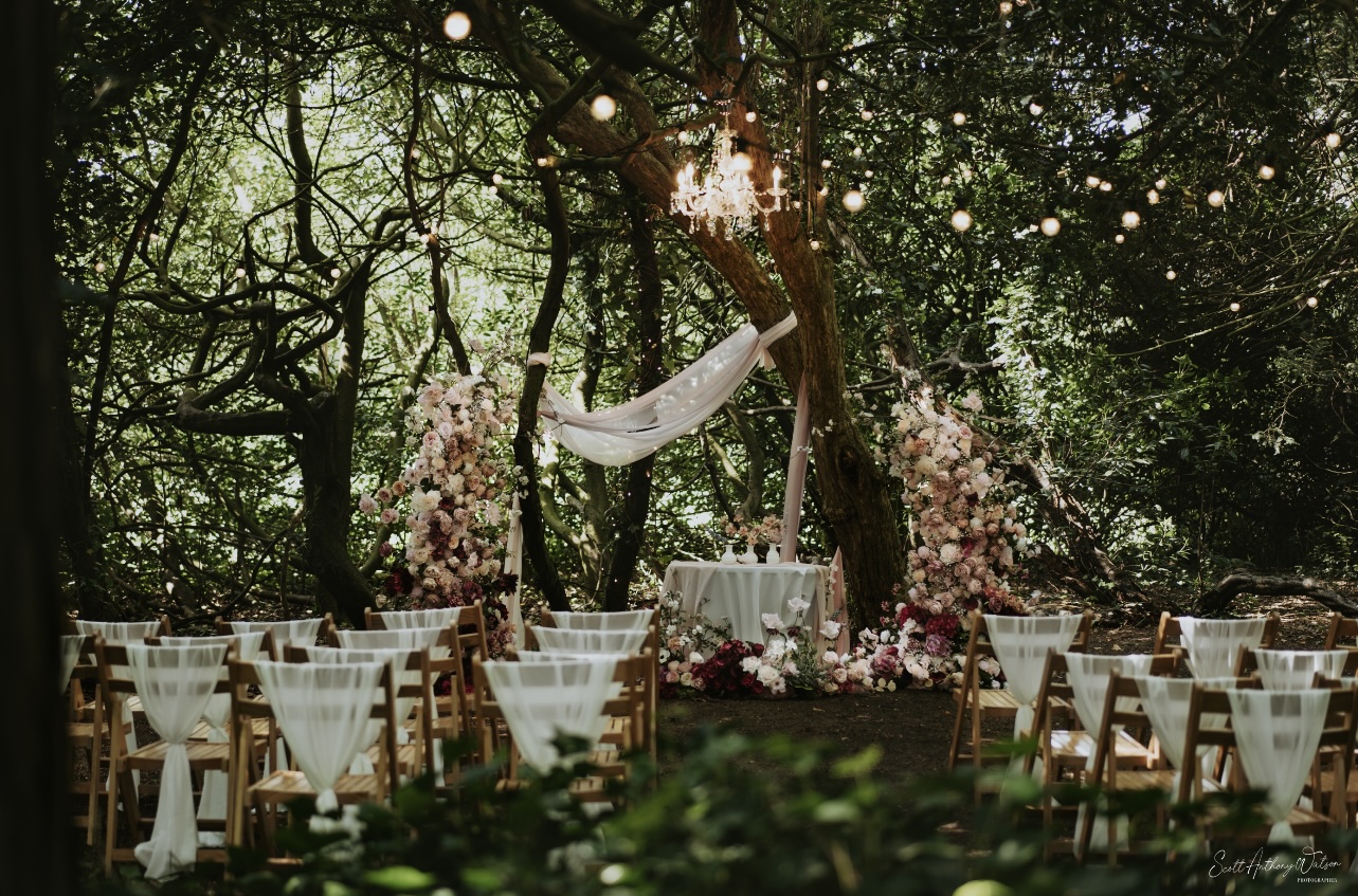 This gorgeous, natural forest is simply magical - with crystal chandeliers, fairy lights and our wooden rustic chairs for added charm. The clearing within the forest comfortably seats up to 100 people for your wedding.